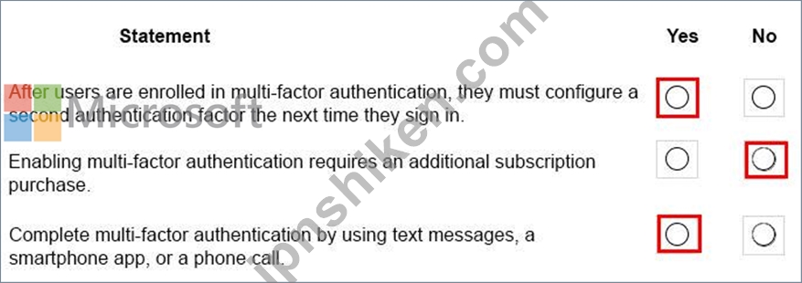 組織には Microsoft 365 サブスクリプションがあります。多要素認証を実装する予定です。次の各ステートメントについて、該当する場合は [はい] を選択します。それ以外の場合は、[いいえ] を選択します。