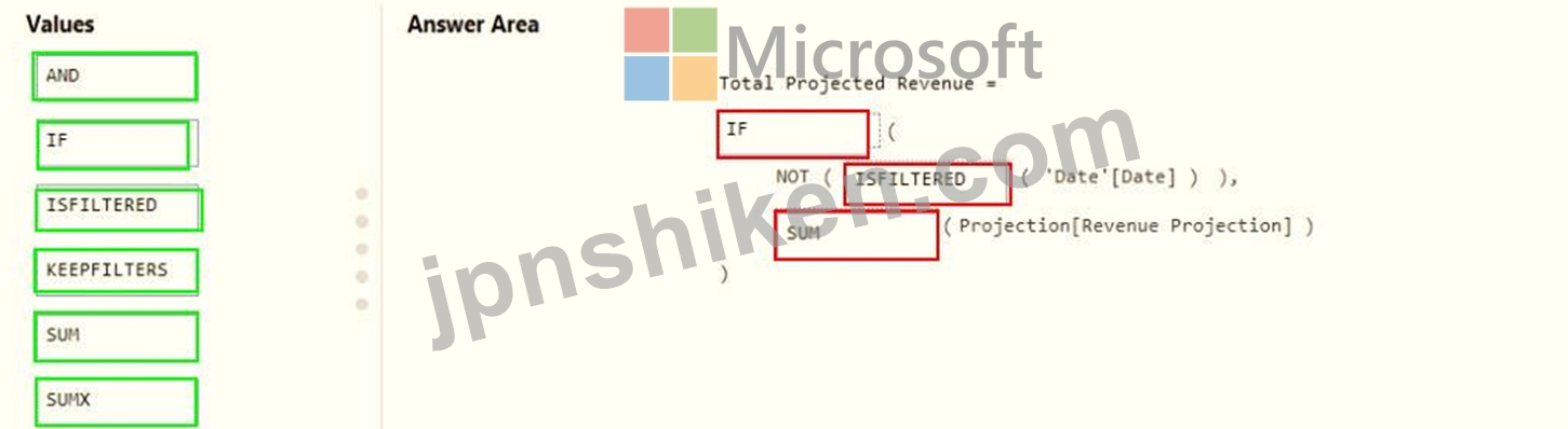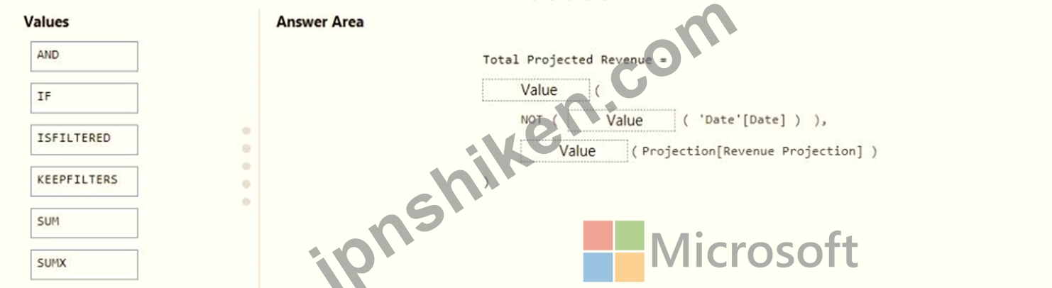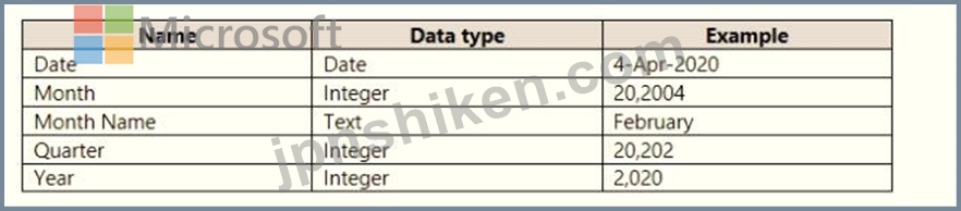 Projections must contain a column named RevenueProjection that contains the revenue projection amounts. A relationship must be created from Projections to a table named Date that contains the columns shown in the following table.