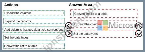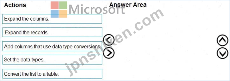 ドキュメントの配列を含む JSON ファイルからデータセットを構築しています。 JSONファイル内のすべてのドキュメントから属性を列としてインポートする必要があります。ソリューションでは、日付属性をMicrosoft Power BIレポートの日付階層として使用できるようにする必要があります。 順番に実行する必要がある 3 つのアクションはどれですか。回答するには、適切なアクションをアクション リストから回答領域に移動し、正しい順序に並べます。