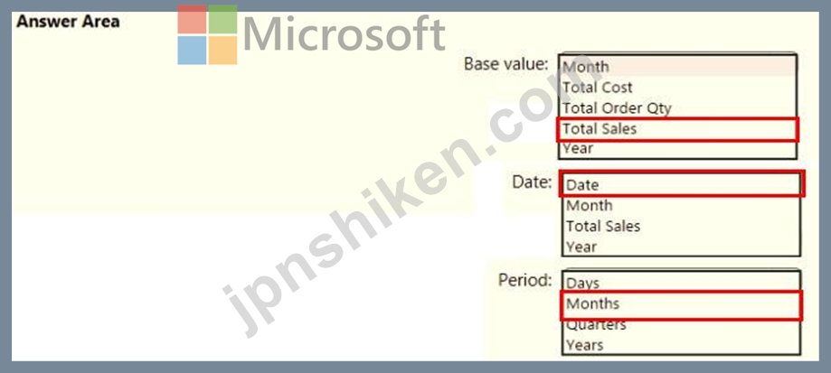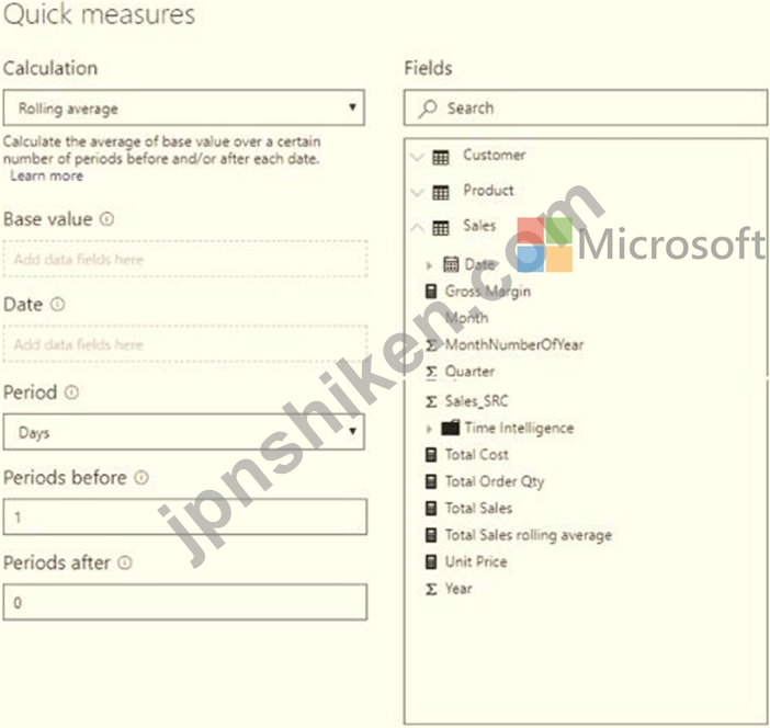 一定期間にわたる売上の月次ローリング平均メジャーを作成する必要があります。クイックメジャー計算をどのように構成すればよいですか? 回答するには、回答領域で適切なオプションを選択してください。