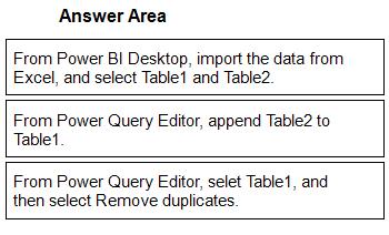 Power Query エディターを使用して、Table1 と Table2 の製品を、重複する値を含まない 1 つの列を持つ次のテーブルに結合する必要があります。