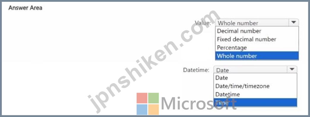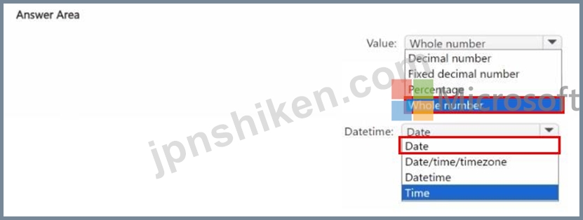 値列と日時列にはどのタイプのデータを使用すればよいですか? 回答するには、回答領域で適切なオプションを選択してください。