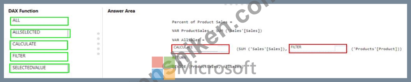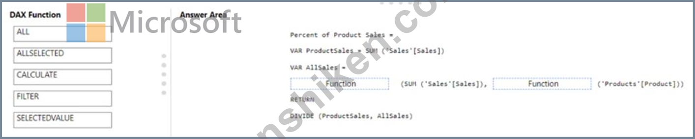 DAXメジャーをどのように完了すればよいですか?回答するには、適切なDAX関数を正しいターゲットにドラッグします。各関数は1回、複数回、またはまったく使用しないことができます。ペイン間のスピリットバーまたはスクロールしてコンテンツを表示します。注:正しい選択ごとに1ポイントが加算されます。