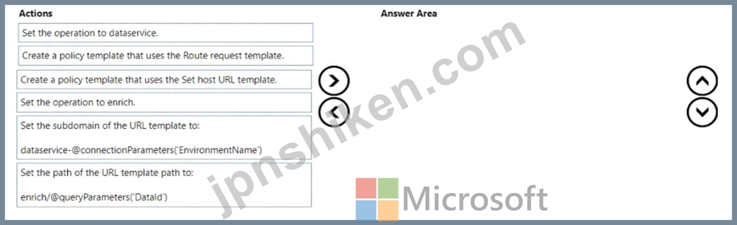 Web API URL に環境名と Datald を組み込むようにカスタム コネクタを構成する必要があります。順番に実行する必要がある 4 つのアクションはどれですか? 回答するには、アクションのリストから適切なアクションを回答領域に移動し、正しい順序で並べます。