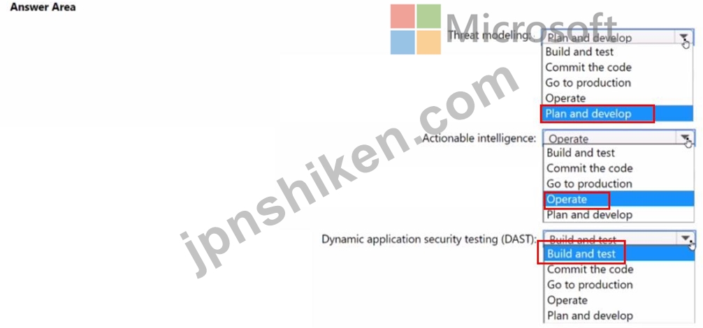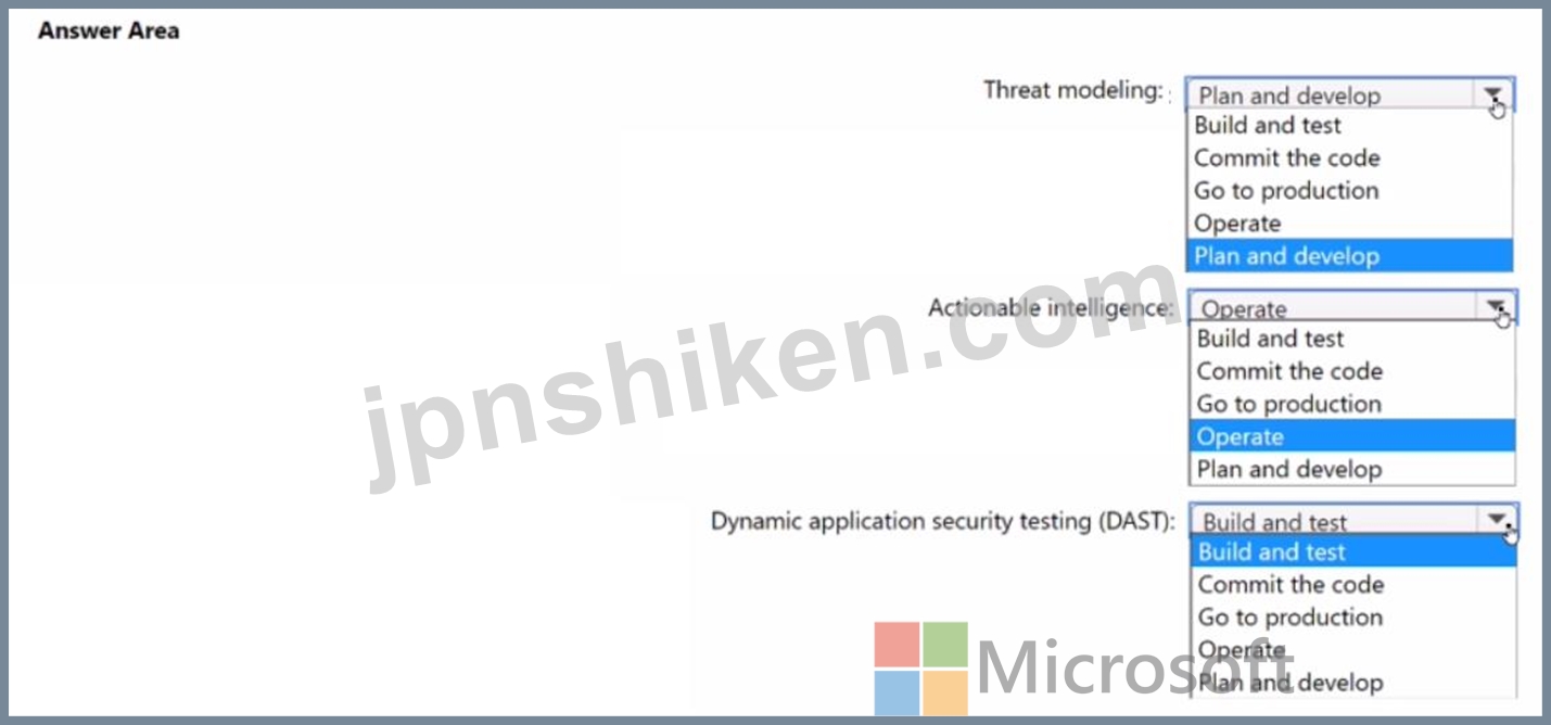 継続的インテグレーションおよび継続的デプロイ (CI/CD) DevOps プロセスのどの段階で、セキュリティ関連の各タスクを実行する必要がありますか? 回答するには、回答領域で適切なオプションを選択してください。
