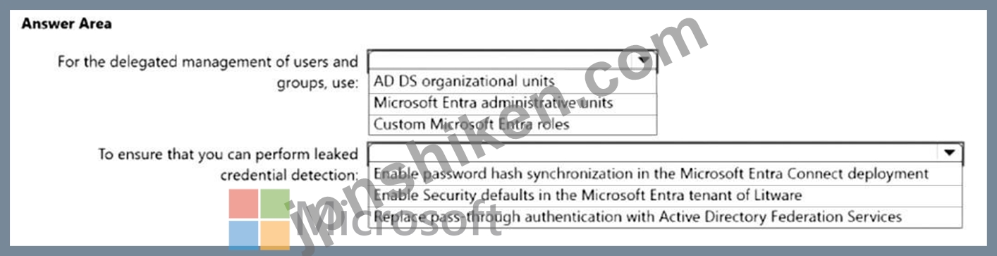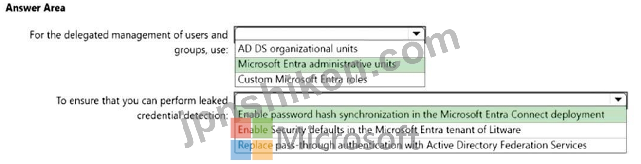 Litware には Microsoft Entra テナントがあり、litware.com という Active Directory ドメイン サービス (AD DS) フォレストと同期し、20 個の Azure サブスクリプションにリンクされています。パススルー認証の実装には Microsoft Entra Connect が使用されています。パスワードハッシュ同期は無効、パスワード ライトバックは有効です。Litware のすべてのユーザーは Microsoft 365 E5 ライセンスを保有しています。