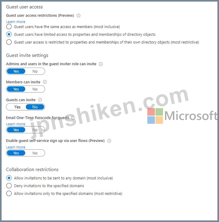 fabrikam.comという名前のドメインを使用するMicrosoft365テナントがあります。 Azure Active Directory(Azure AD)のゲスト招待設定は、展示に示されているように構成されています。 ([展示]タブをクリックします。)