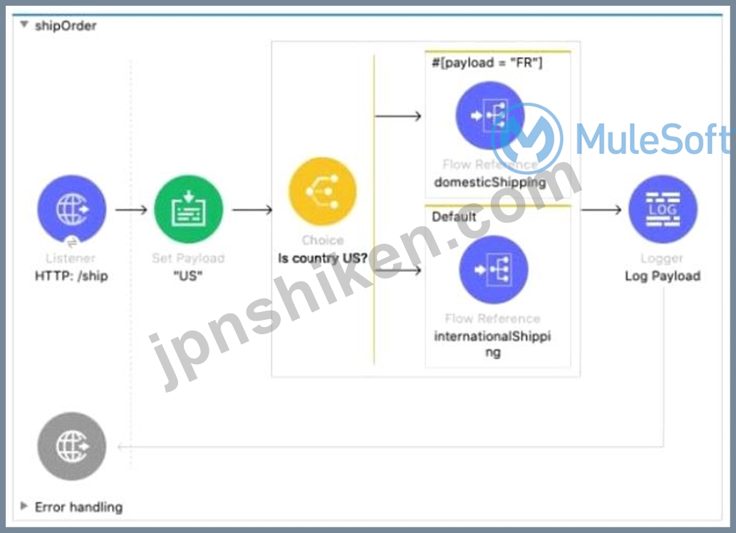 Choice ルーターでは、domestic Shipping ルートの When 式が「#[payload = 'FR']」に設定されます。Choice ルーターの完了後に何が記録されますか?