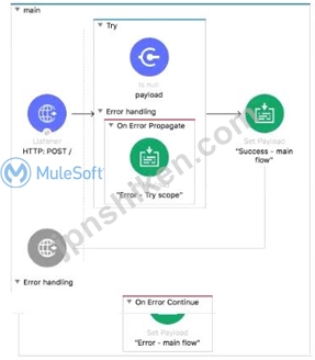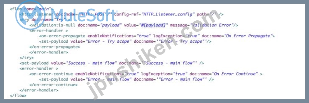 Note that private flow has error scope defined as On Error Continue . So when error occurs in private flow , it is handled by this On Error Continue scope which sends success response back to main flow and does not throw back an error. So main continues normally and payload is set to Success - main flow.