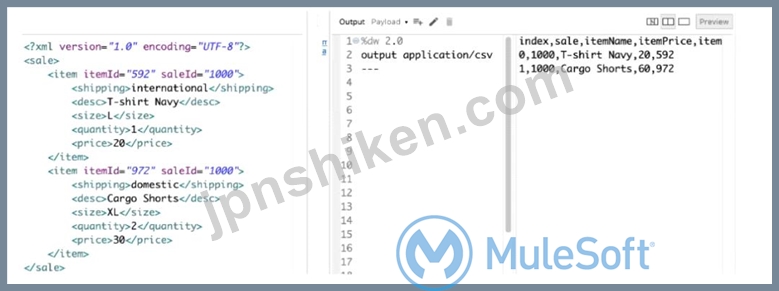 質問46 XML 入力例を CSV 出力に変換する DataWeave 式はどれですか? (E...