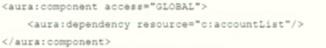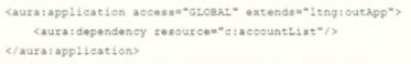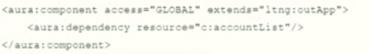 Visualforce ページで使用される Lightning コンポーネント c:accountList への依存関係を宣言するために記述する必要がある Lightning コードセグメントはどれですか?