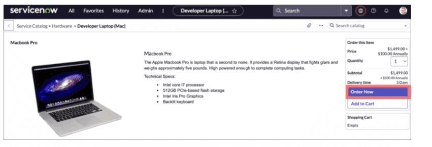 ARequested Item (RITM#)is generated to track the MacBook order.